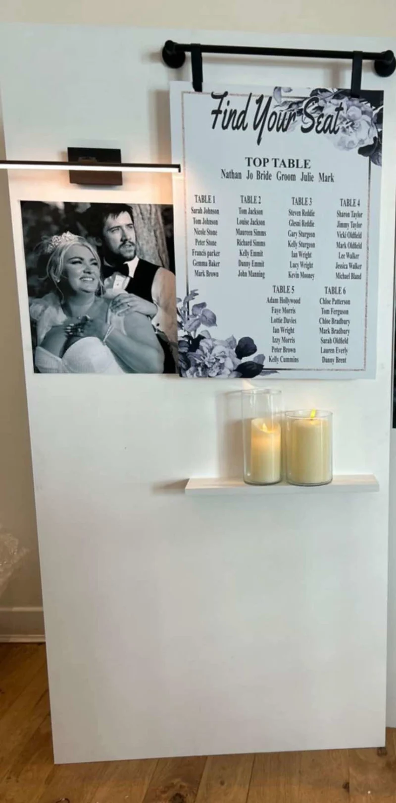 The table plan hangs gracefully from a black rail, helping loved ones find their seat with ease.